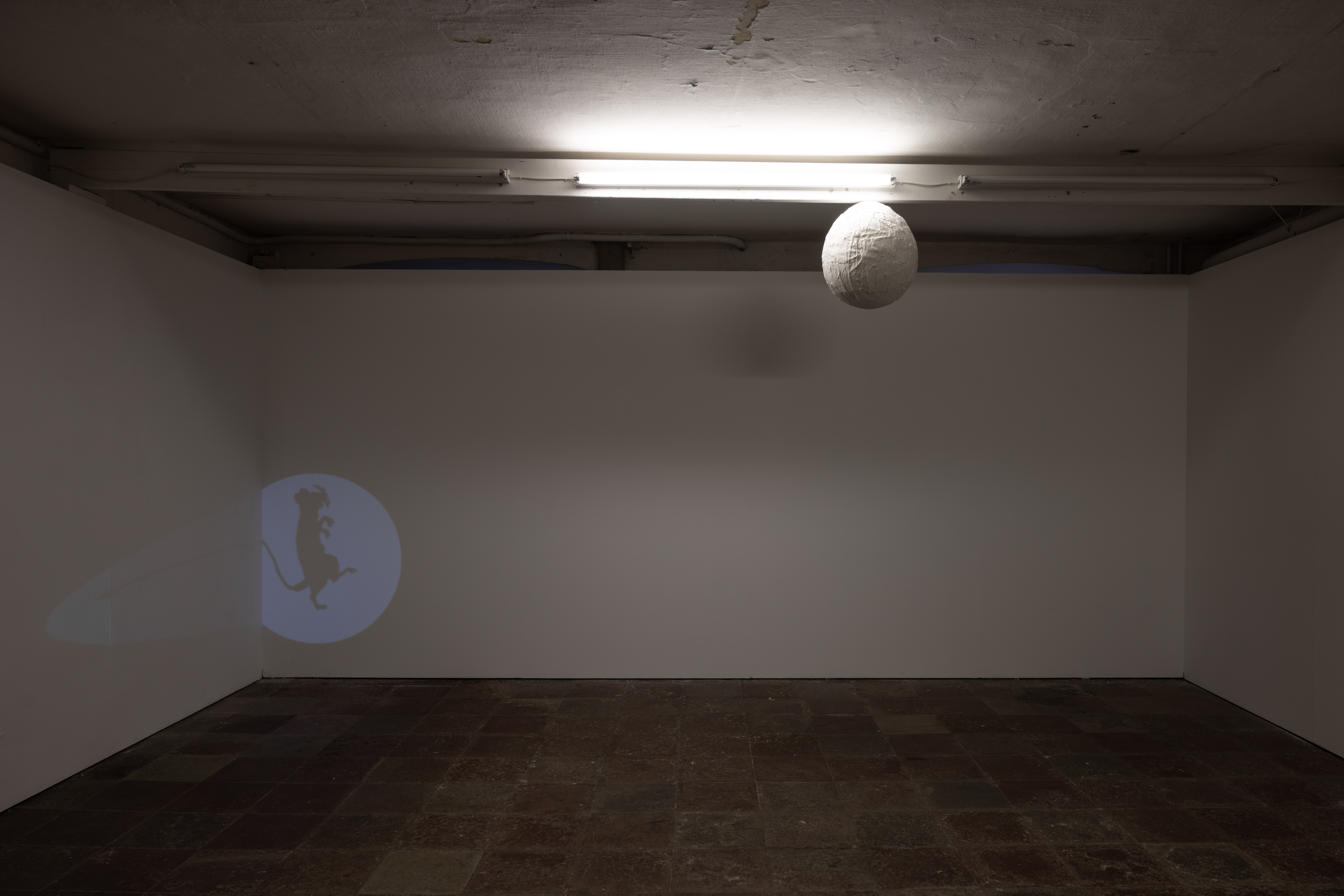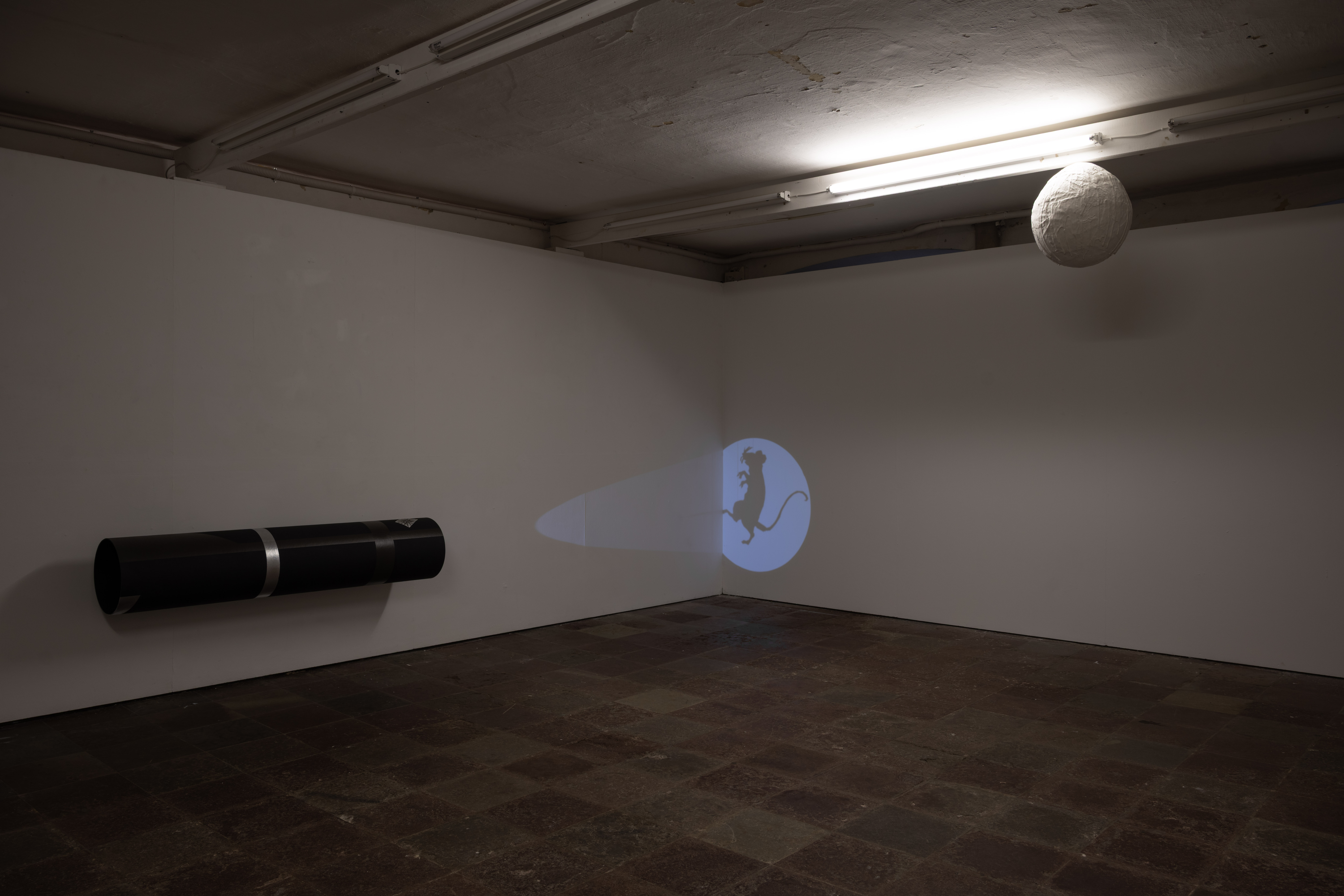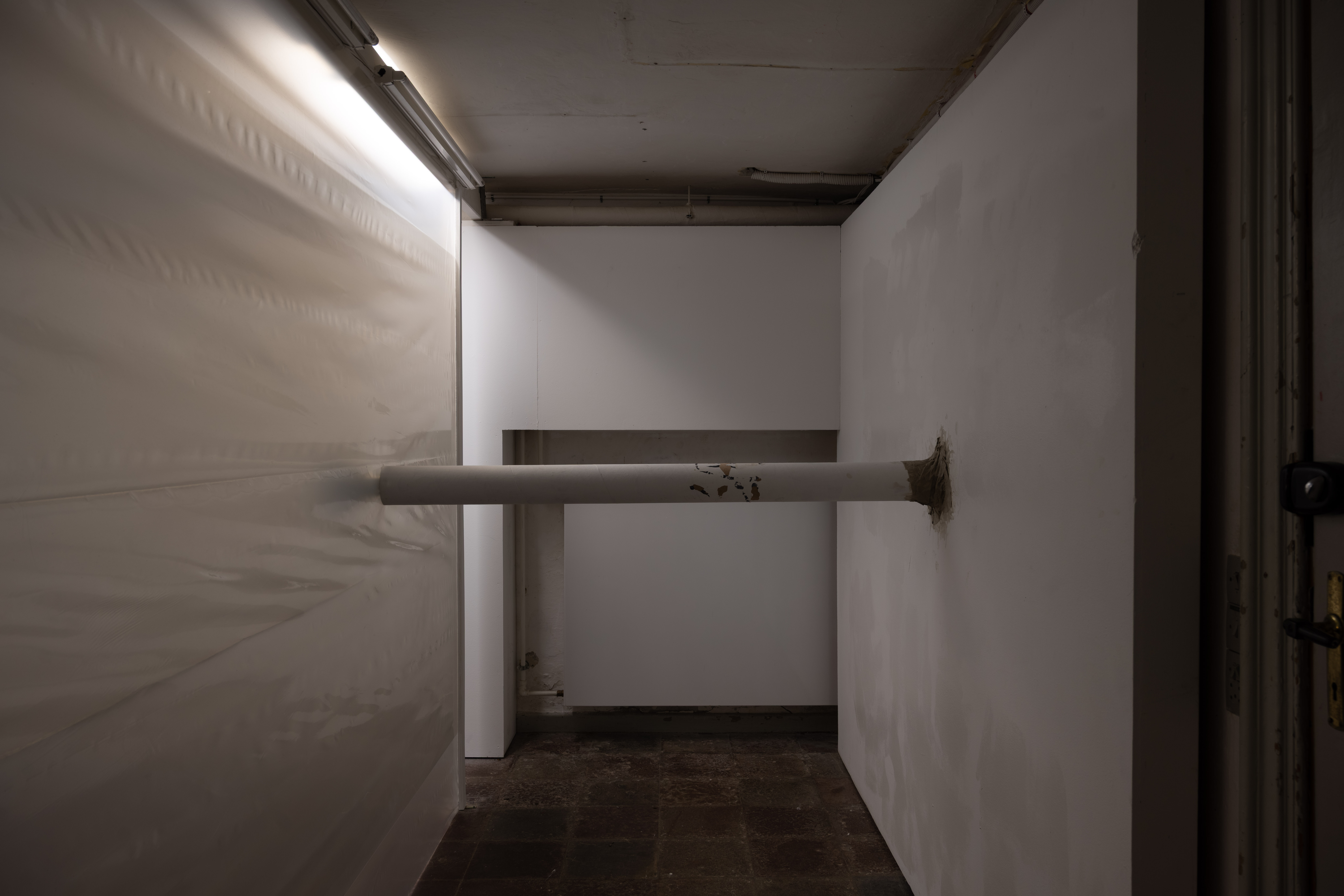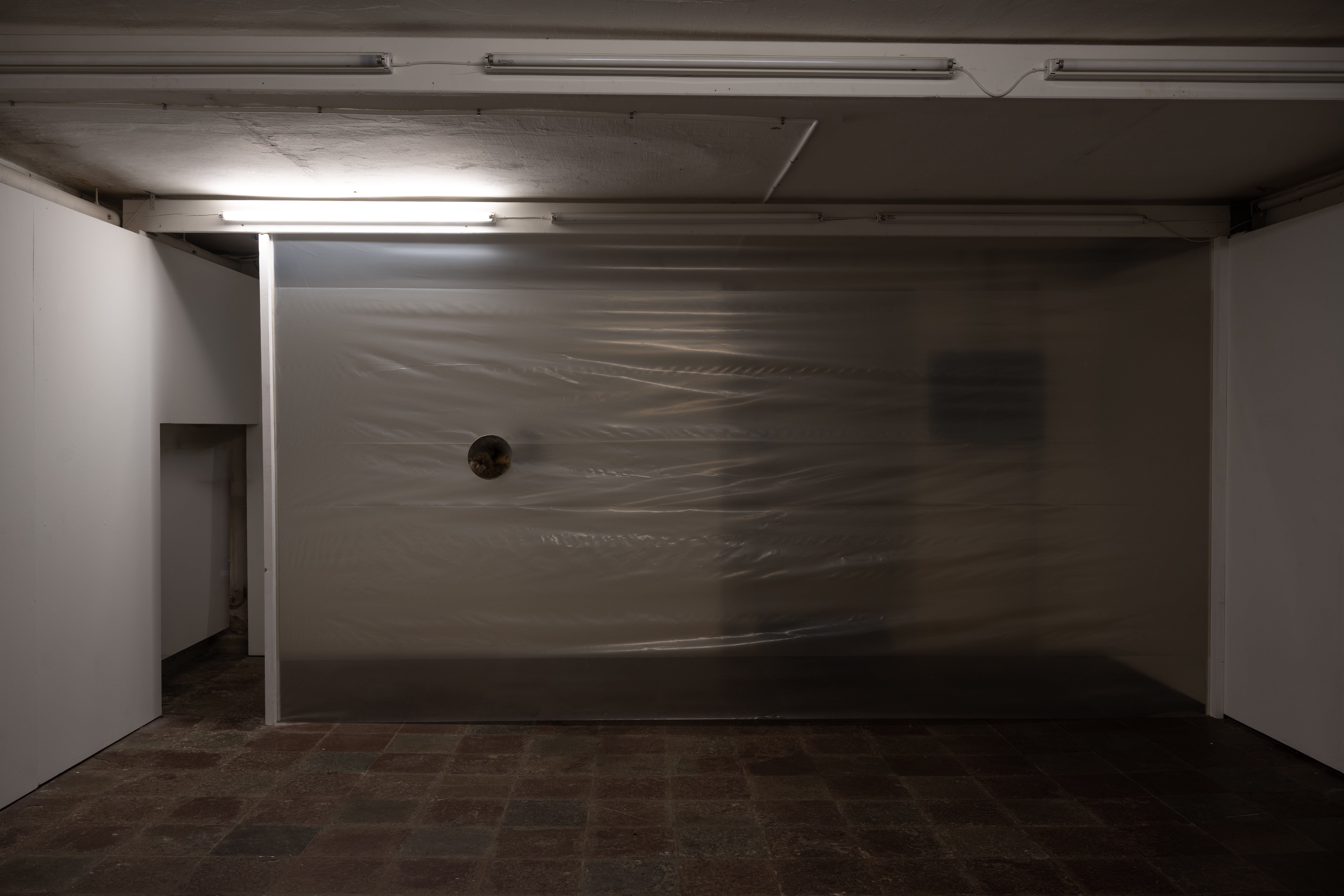 The exhibition translates this encounter into spatial terms. A translucent plastic film divides the room vertically, transforming the entrance into a narrow passage that directs visitors along an altered route through the architecture, echoing the pathways once traced by the mouse. Other elements extend this narrative across the space, shifting the conditions and atmospheres of the Ping Pong basement, and presenting a site that draws attention to the interplay of above and below, the seen and unseen.