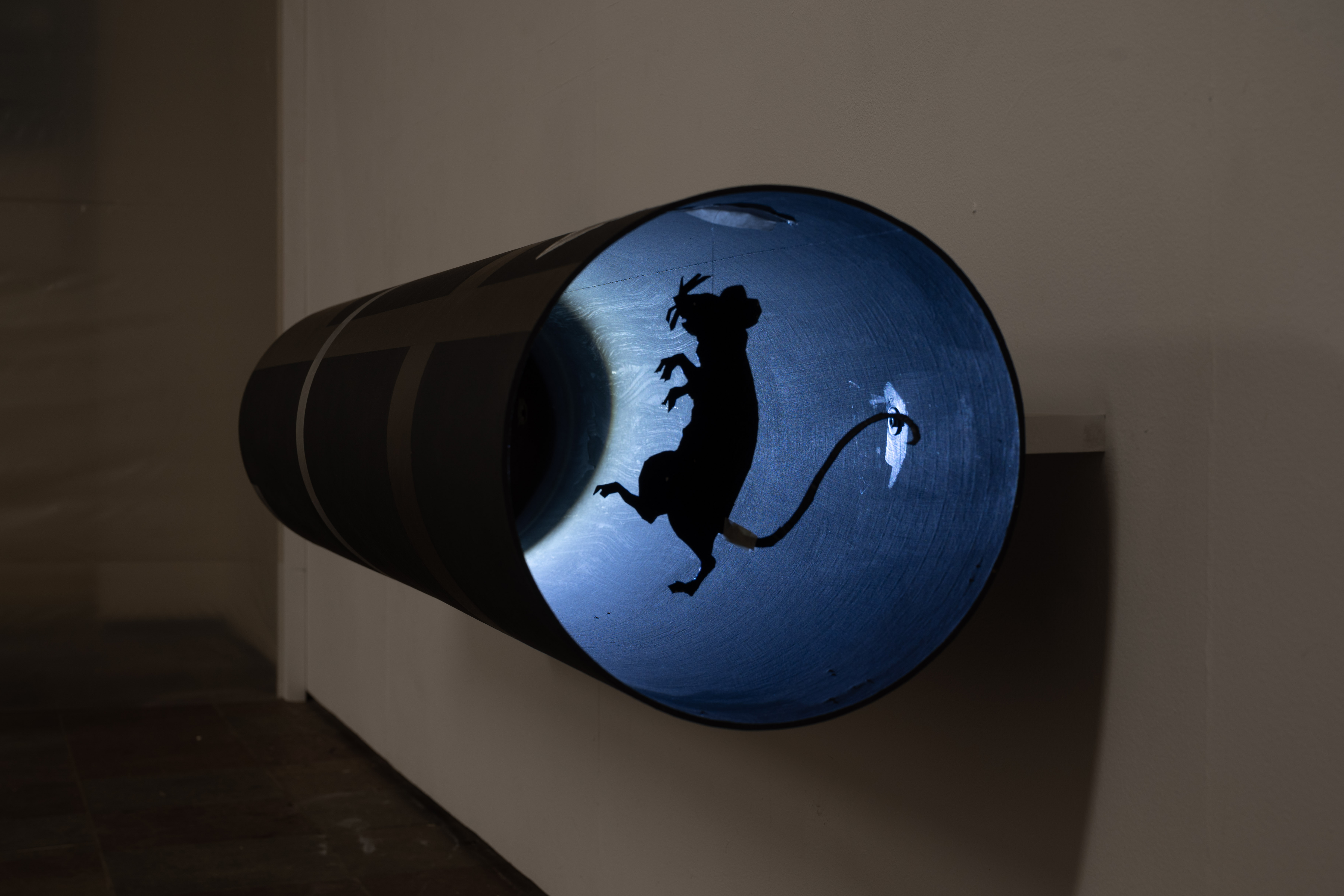 Some months ago I was having a late dinner in the studio kitchen of the sculpture school when I noticed small mouse making its way down the human-sized staircase. What struck me was that the place it came from is the highest point of the ground floor, reachable only by a few steps that, from the outside, seem impossible for a mouse to overcome. Intrigued, I set up a night-vision camera in the days that followed and scattered breadcrumbs as bait. The mouse returned, and the recordings revealed its remarkable climbing abilities. I began constructing passages from cardboard tubes, enabling it to traverse the architectural barriers of the school.